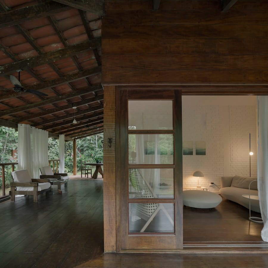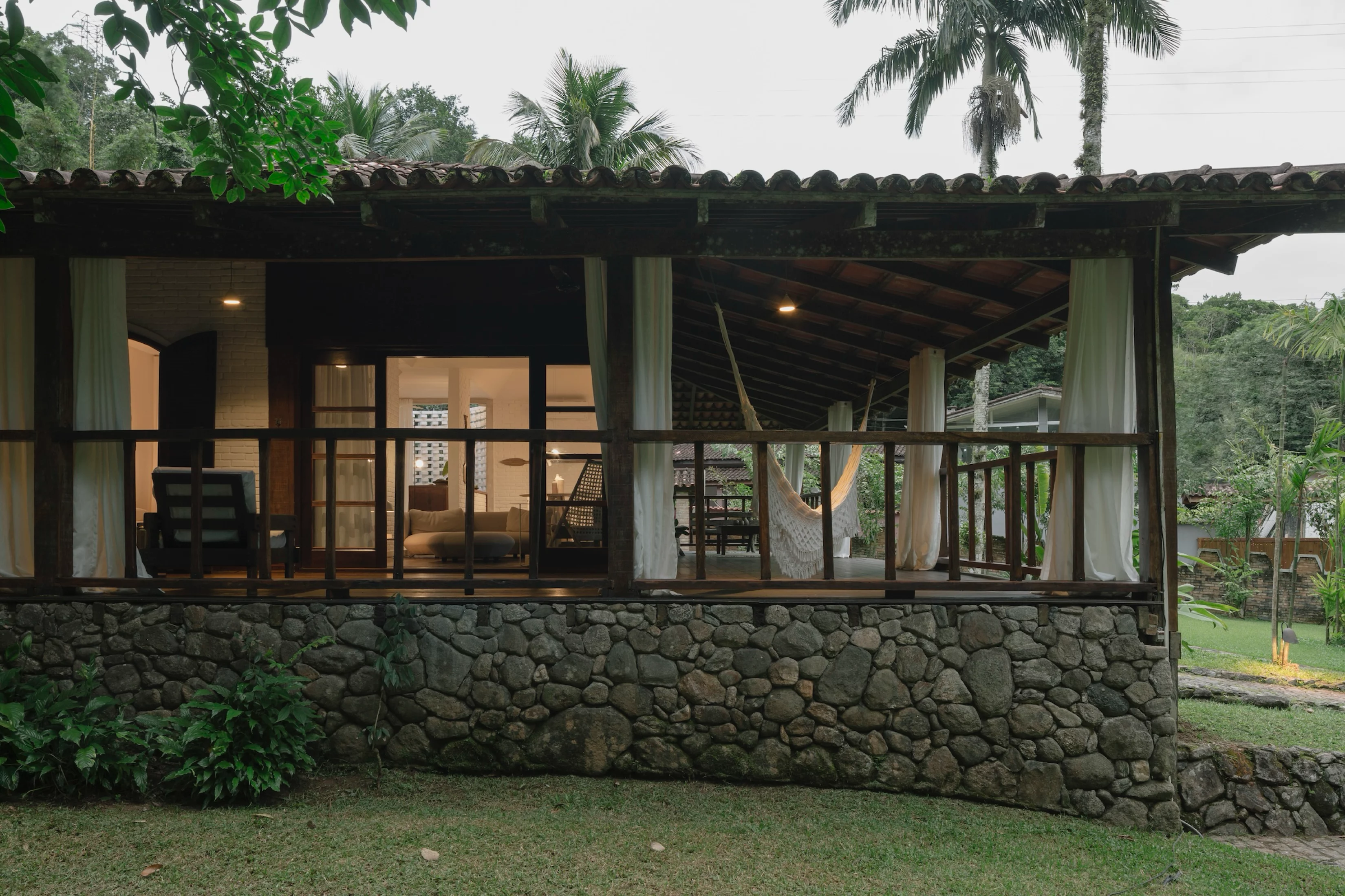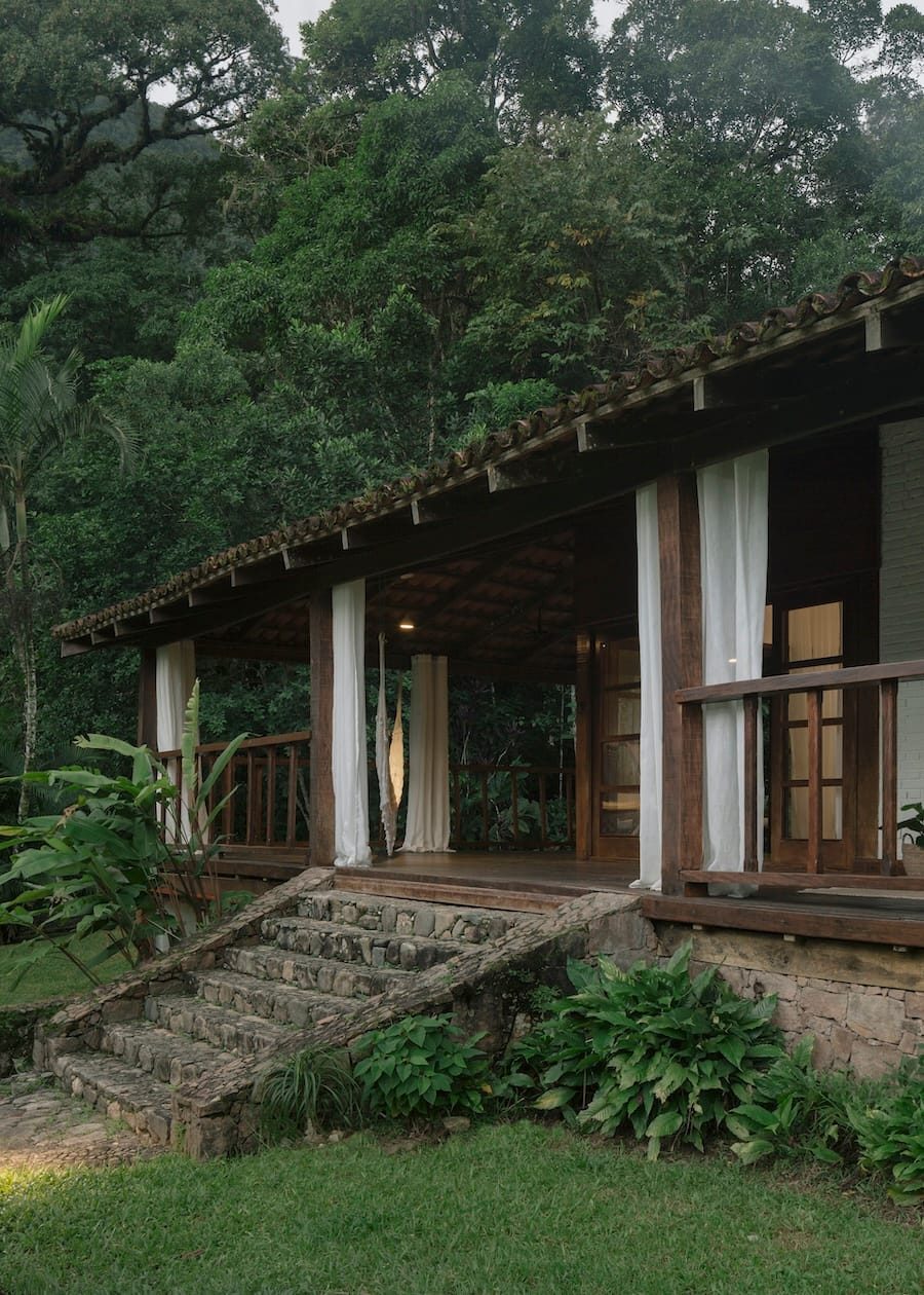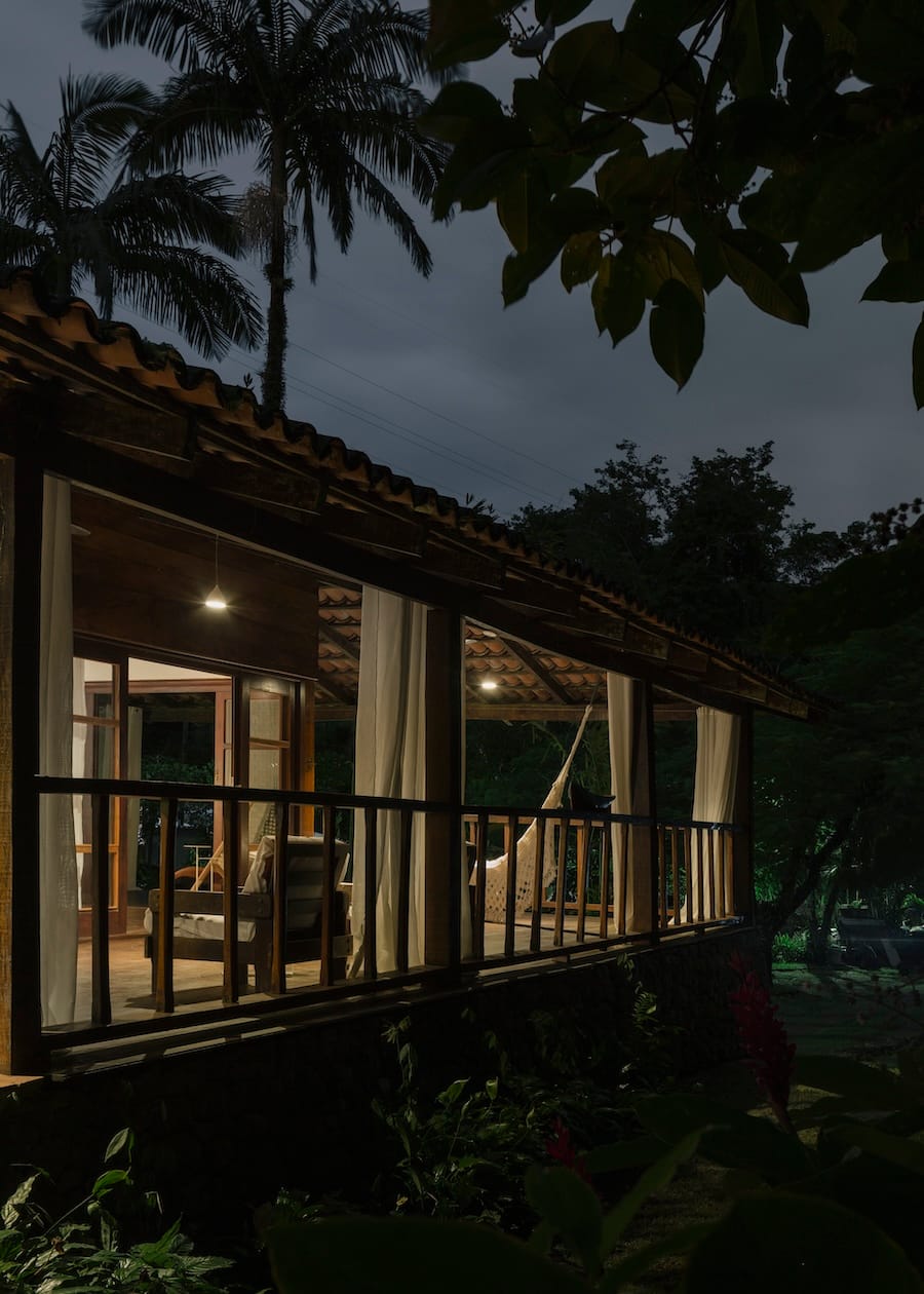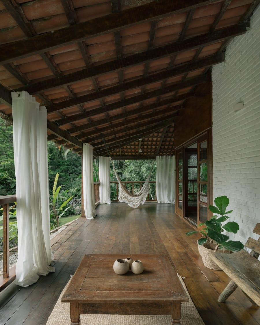A grande varanda é o coração da casa, ideal para contemplação ou celebrações ao ar livre. Com vista para a natureza exuberante, é um refúgio sereno durante o dia, perfeito para relaxar e apreciar a paisagem. Além de uma piscina natural logo à frente da casa, para revigorar e refrescar.