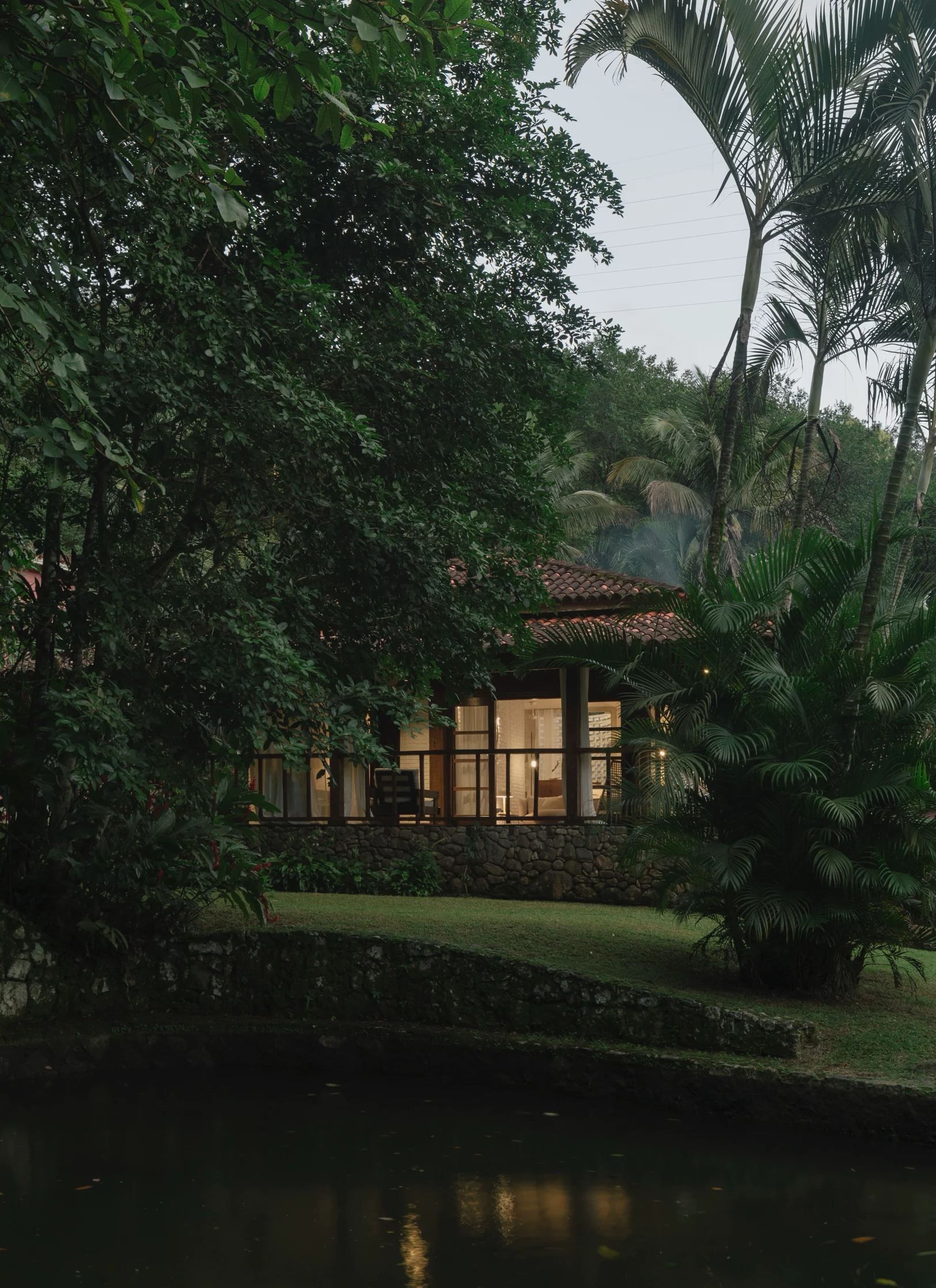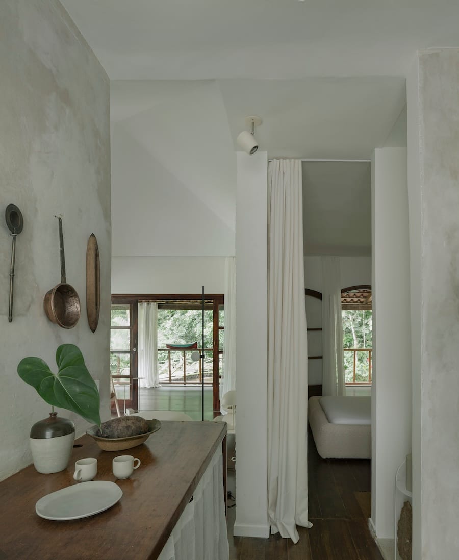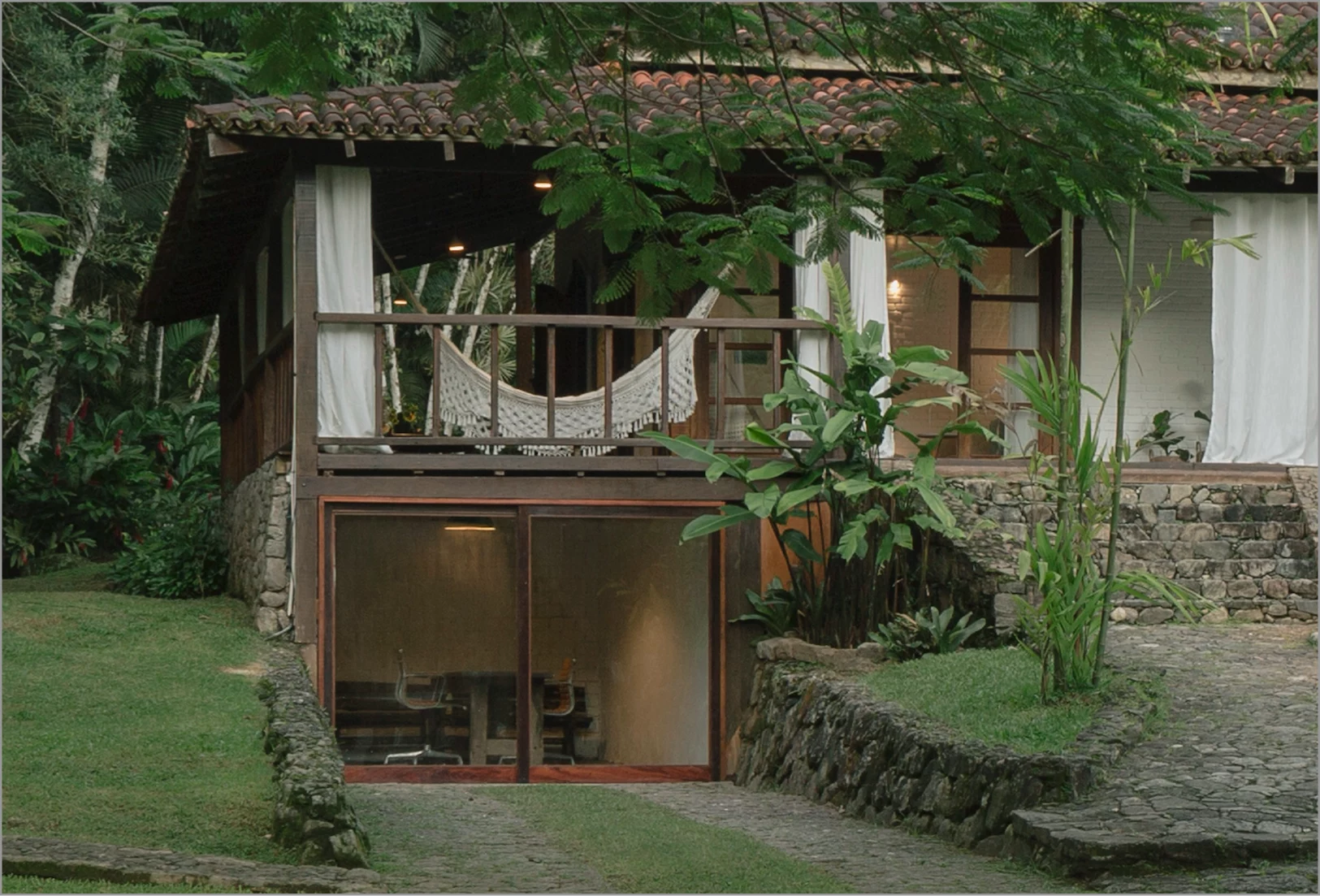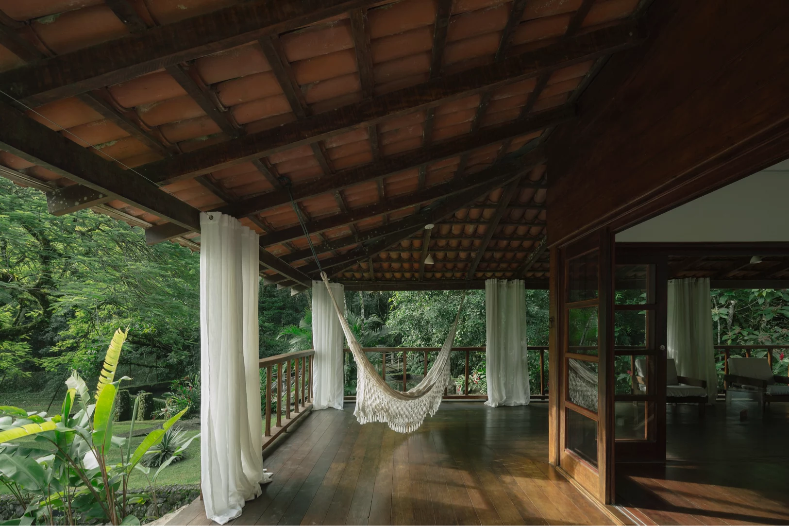 A grande varanda é o coração da casa, ideal para contemplação ou celebrações ao ar livre. Com vista para a natureza exuberante, é um refúgio sereno durante o dia, perfeito para relaxar e apreciar a paisagem. Além de uma piscina natural logo à frente da casa, para revigorar e refrescar.