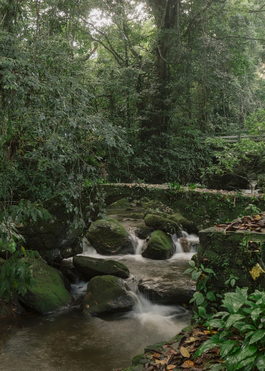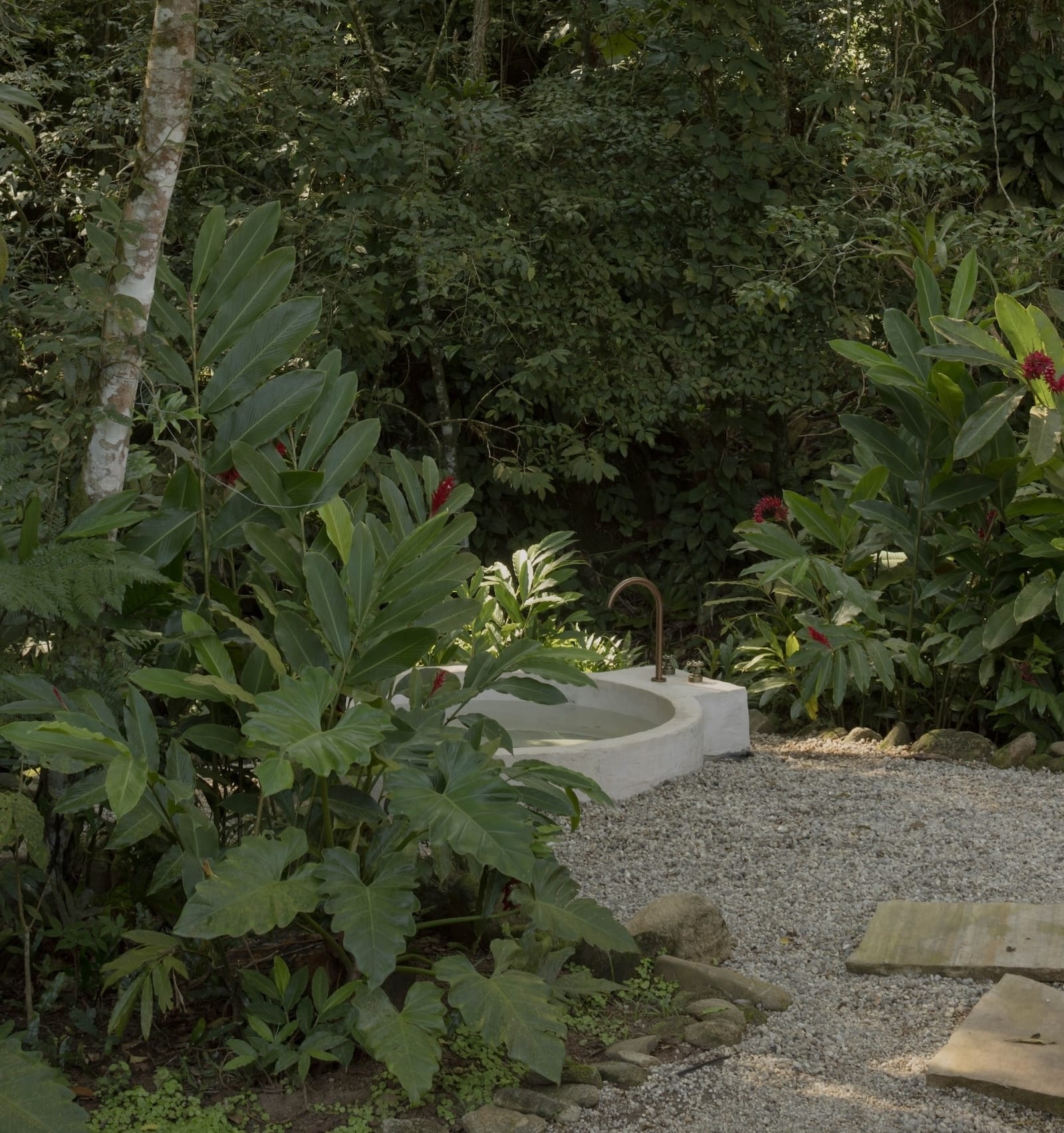 Um ofurô em meio à natureza oferece uma experiência singular, onde os sons da água corrente da cachoeira e o frescor da mata criam um estado de presença e relaxamento profundo, se beneficiando do poder restaurador da natureza.
